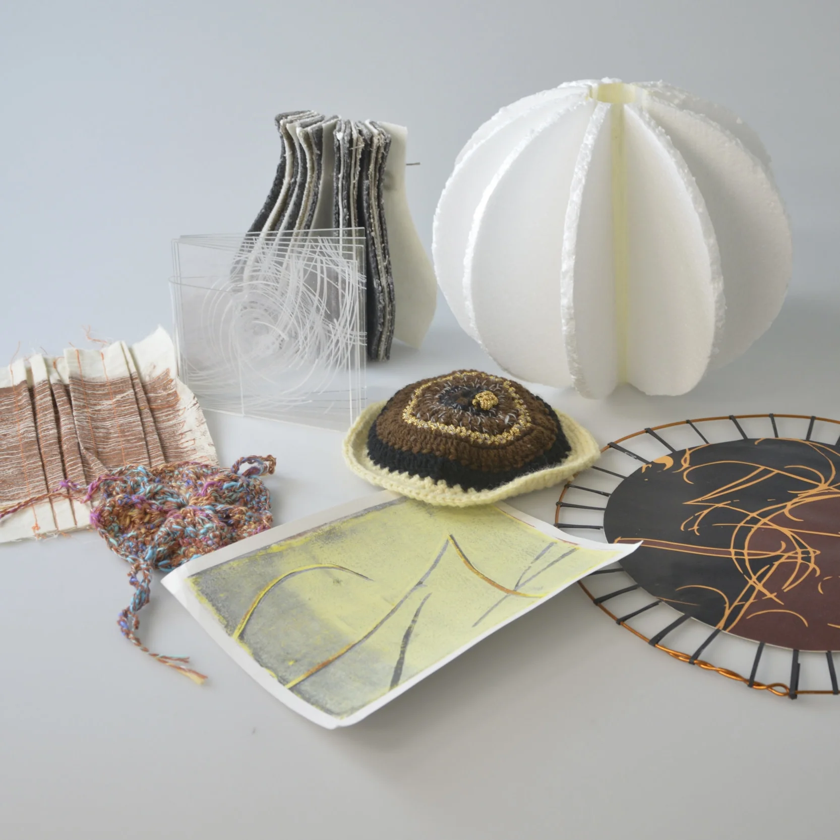 ‘Movement through Process’ is a work that reflects the physical aspect of motor senses and the connectivity between left- and right-hand intuitive engagement working in synchronicity. Through the use of stitched and woven textile, etched acrylic, print, waxed cloth and metal, these materials in combination support the value of the broader disciplines within craft today.